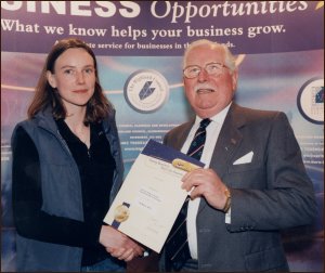 Tasha Lancaster of Eigg is pictured here receiving an award from Bill Fraser, Chairman of the Shell LiveWIRE Youth Entrepreneur Awards. Tasha and husband Brigg came fourth in the Highland final of the Award scheme, for their Rocking Horse Workshop on the Isle of Eigg - the only such workshop in Scotland. Their prize is £200. The winner of the Highland final was Patrick Gray of Tongue in Sutherland, for his business, Planet Boo Communications. All finalist businesses have been supported also by The Prince's Scottish Youth Business Trust. Last year's winner was Arisaig's Ross MacEachen for his single eyed Cyclops Creel. |