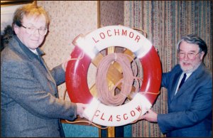 Denis Rixson (left) receiving the lifebelt from Dr. MillsAt a dinner/reception in the West Highland Hotel, Mallaig, on the 21st. March 2001. Dr. Harold Mills, Chairman of Caledonian MacBrayne Ltd., presented Denis Rixson, curator of the Mallaig Heritage Centre, with a lifebelt from the MV Lochmor, the Small Isles and Skye passenger ferry which had been based at Mallaig for the past twenty years. The ship's bell and a montage of pictures of the Lochmor will also be handed over to the Heritage Centre in the coming weeks.