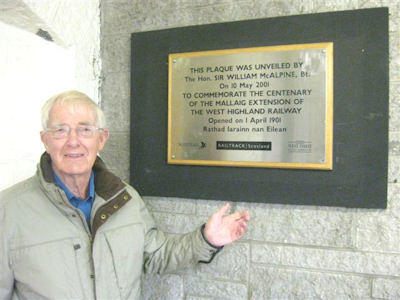 On the 10th May 2001, Sir William McAlpine travelled to Mallaig by train and unveiled a plaque to commemorate the one hundredth anniversary of the opening of the line. The plaque is in Mallaig Station waiting room, and the photograph shows ex-steam train driver Elliot Ironside alongside it. ScotRail and Network Rail are not planning any 110th celebratory events; maybe we will have to wait until the line is 125 years of age before any recognition of the history of the line is held.