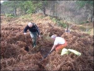 We carried them to their new situations on a south-west facing slope in good soil amongst low bracken. As a contrast several of the smaller ones were planted along the hillside in a wetter area on ground formerly covered in dense Rhododendron ponticum. Generous holes were dug by Phil and his team of three, the roots laid out and then the top soil replaced and firmed in around each tree. We spaced them well apart to allow room for individual growth.
