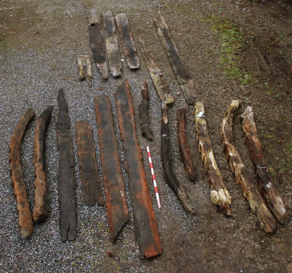 | Oak stakes and ribs from the Galmisdale wreck, showing the clinker built features which were recorded in 2002 when the wreck was discovered during the construction of the new Eigg causeway. Wessex Archaeology, who conducted the review of the site last year and the present rescue operation to stabilise the wreck, is funded by Historic Environment Scotland. Their interest is to check how the wreck remains relate to the vernacular Highland tradition of boat building, which itself has direct ties to an earlier Norse boatbuilding tradition. | ![]() |