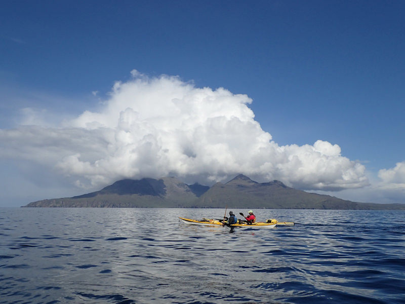 On Friday 27th six paddlers took the ferry out to Canna with one straggler joining the party on the Saturday! Saturday was spent circumnavigating Canna in strong northerly winds which made for some confused seas at the west end of the island but the group returned safely to their campsite above a white sandy beach on the neighbouring island of Sanday. The next day the winds were forecast to increase to F5/6 so it was decided to have a quiet day on Canna before setting off on Monday for the west side of Rum. It was a day of visiting the gardens of Canna House, the ancient Celtic cross and sampling the delights of the amazing shop and café! Four of the group opted to paddle round Sanday where they encountered blue jellyfish and hundreds of Puffins nesting on Dun Mor before paddling the last few kilometres home into the teeth of the F5/6 winds! The following day it was up early and on the water by half eight. After delivering one injured paddler to the ferry (an unfortunate fall on some slippery rocks at the campsite) they set off with a following wind and sea to the most westerly point of Rum, A'Bhrideanach. The west coast of Rum offers little in the way of landing spots, so it was not until Harris that they managed to struggle ashore for lunch and a sighting of the mausoleum. After lunch it was on round the most southerly point of the island at slack water and on to assess the possibility of landing for the night at Dibidil. However the sea had calmed and the paddlers felt strong so it was decided to paddle the nine kilometres to the west coast of Eigg and surf ashore! From here after setting up camp they were treated to great views back to Rum.