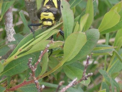 In this photo the head of a Golden-ringed Dragonfly (Cordulegaster boltonii), with the huge eyes and frontal shield to its mouth clearly visible. It had just eaten a blue damselfly while sitting on a bog myrtle bush.