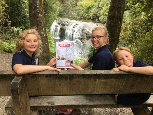 Susie, Isla and Dougal, grandchildren of Hamish and Joan Smith, caught up with all the news from the West whilst visiting Coal Creek Falls in New Zealand.