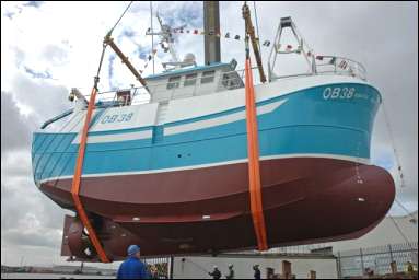 Skipper Robert Summers' new twin-rig prawn trawler is the first skipper-owned trawler to be built for Mallaig for nearly ten years. Built by MMS Repair & Dry Dock Company at Hull, the 16.5m vessel has been named Rebecca Jeneen after Robert's daughters Rebecca and Jennifer and wife Noreen. The whole family were in Hull for the launching last month, including Robert's father Jock and mother Margaret, who named the boat in time-honoured fashion with a bottle of bubbly. The trawler features a completely new deck layout and working arrangements. The fitting out work is expected to take three to four weeks, and Robert hopes to be fishing his way home by the end of November. Robert and Noreen's previous boat, Ocean Trust OB38, built in MacDuff in 1982, has been sold to Mallaig's Tony Kenning and re-registered as OB381. |