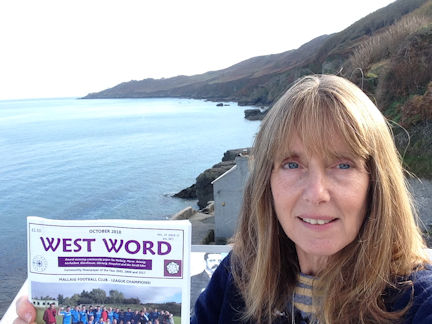 Here is Deb Ingram, teacher, Isle of Rum Primary, reading her West Word at Hallsands near the Start Point lighthouse in South Devon. Hallsands fishing village washed away in the great storms of 1917 but the ruins still cling to the cliffs. The viewing platform is a popular stopping point on the South Devon coast path. Deb says it's a great place to spend the October 'tattie' school holidays!