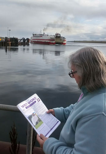 Former editor Ann took a look at her copy (with front cover of her granddaughter's artwork) at St Margaret's Hope in Orkney, waiting for the Pentalina to dock. Ann and husband Richard were pleased to witness the arrival in Orkney of Pentland Ferries new catamaran ferry, MV Alfred, from its trip from the shipyard in Vietnam. Alfred is hailed as the most environmentally-friendly ferry service of its kind in Scotland, with a shore-based wind turbine providing power when the vessel is docked overnight. But Ann had a big fail in trying to meet up with ex-Knoydart resident Cath Curd in Kirkwall despite best efforts from both!
