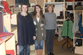 ![]() (l to r): Jennie, Sarah and Anna in the shop which is also the workshop. Jennie and Sarah are wearing Anna's designs. |